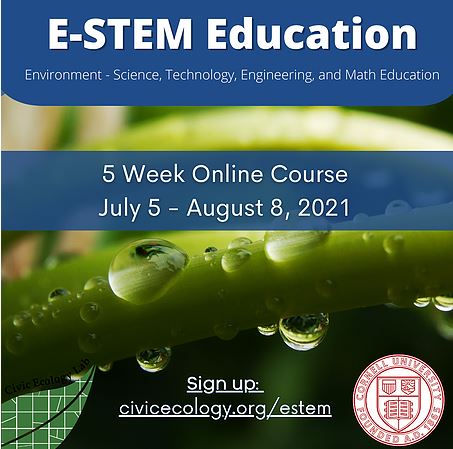 Staff Volunteers are eligible for reimbursement for environmental education training. One great opportunity in the near future is a course in E-STEM (Environment-Science, Technology, Engineering, and Math) Education offered by the Civic Ecology Lab of Cornell University.